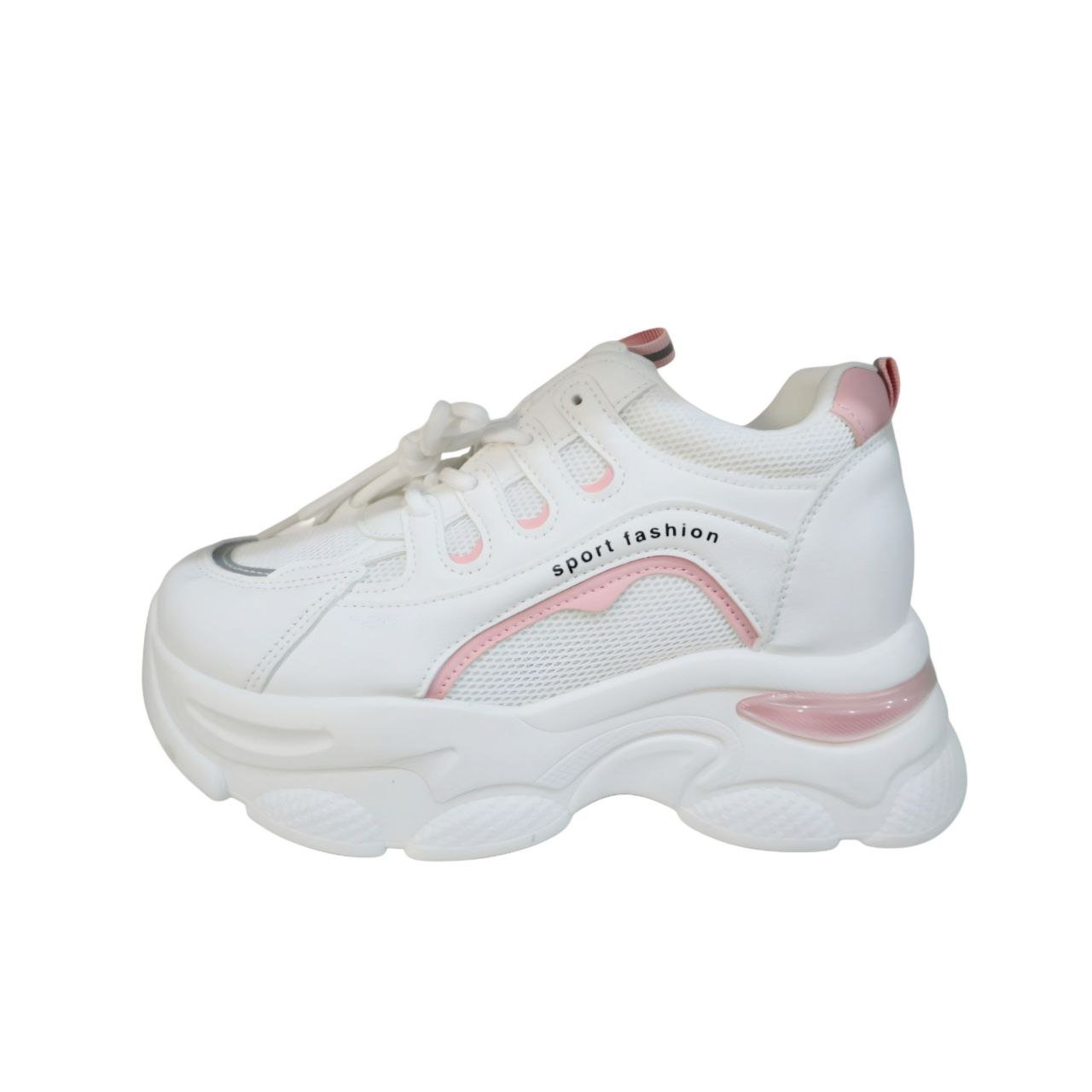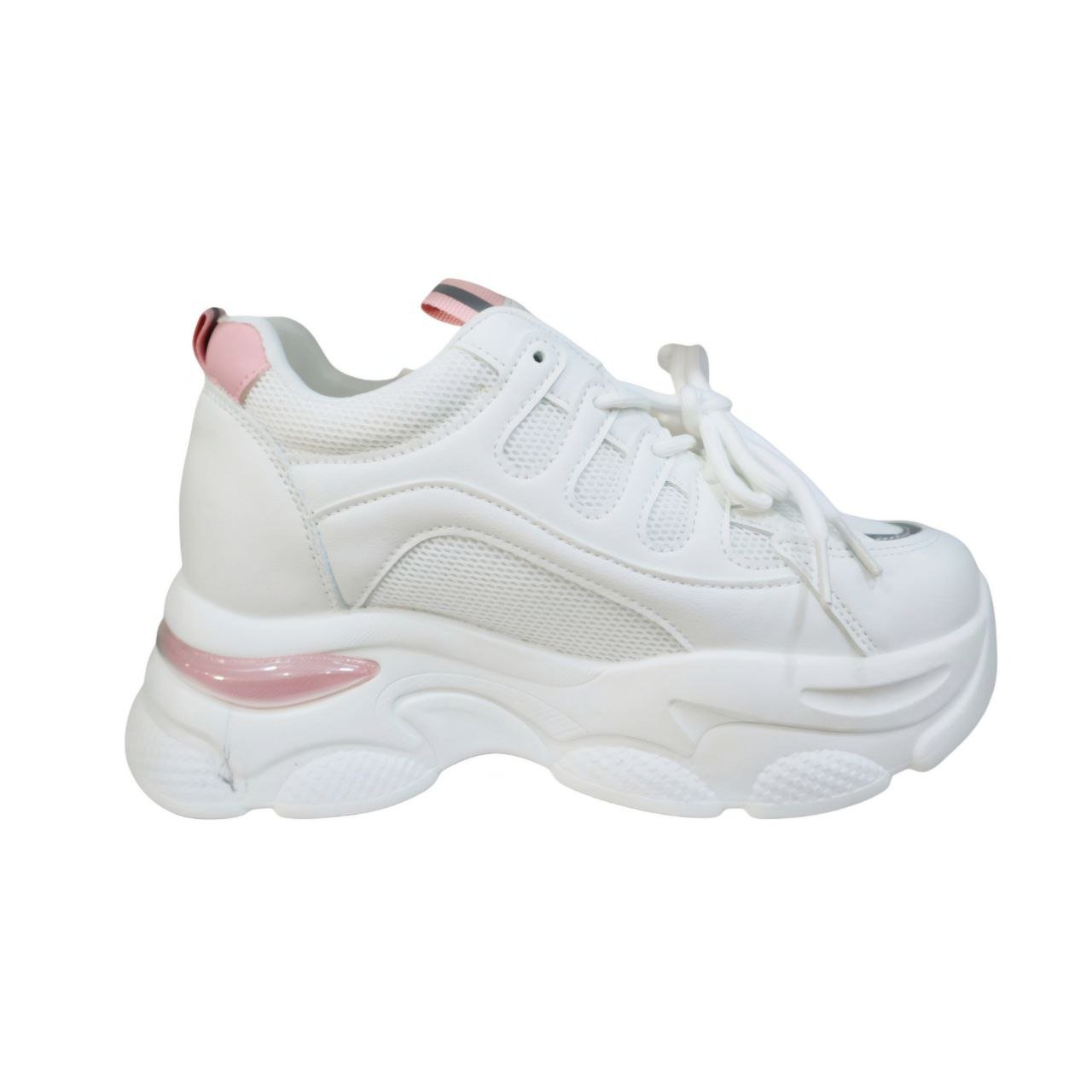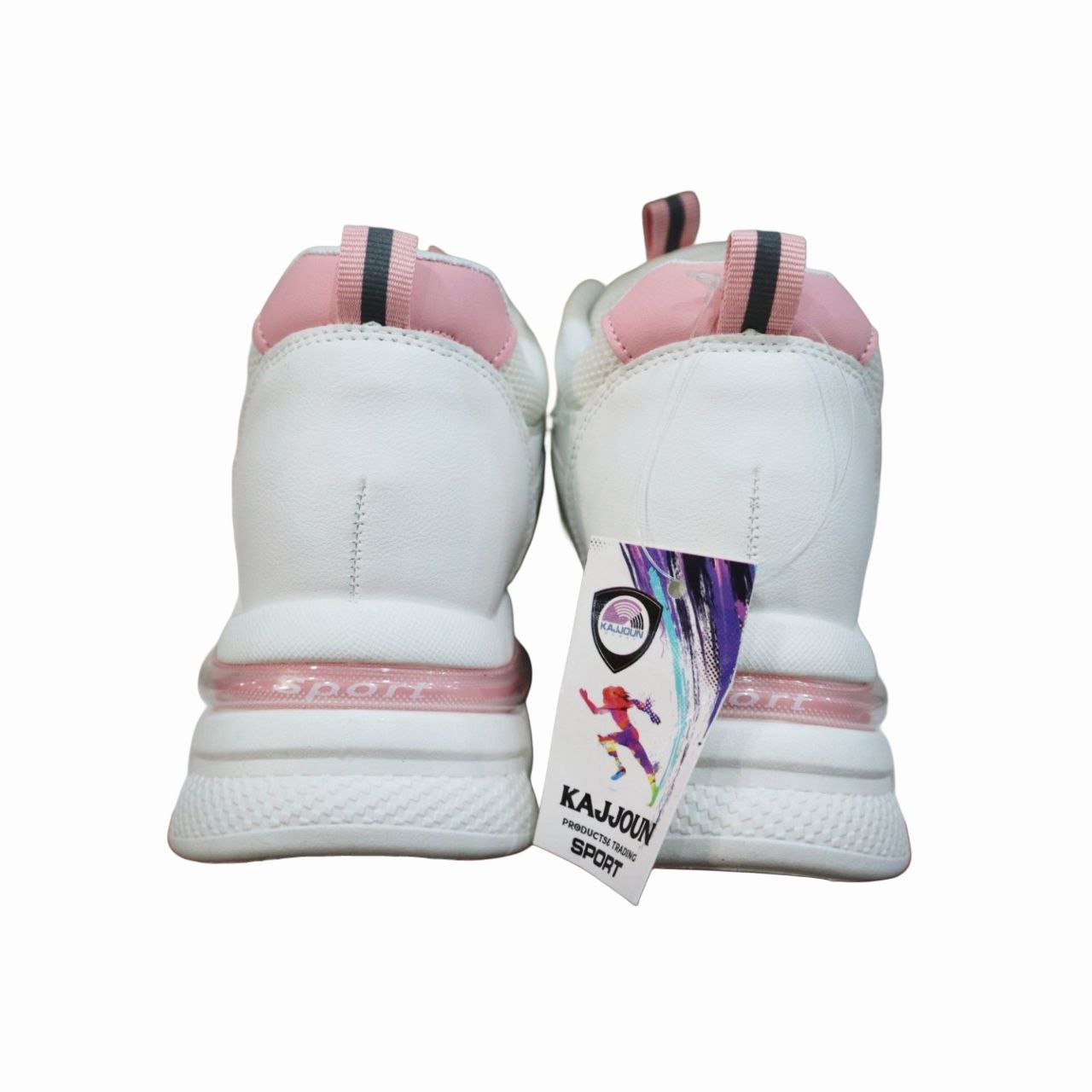 - الألوان والتفاصيل: يسيطر عليه اللون الأبيض النقي الذي يمنحه مظهراً منعشاً وأنيقاً، مع لمسات ناعمة وأنثوية من الوردي الباستيلي تظهر في تفاصيل الكعب والجزء الخلفي من النعل.