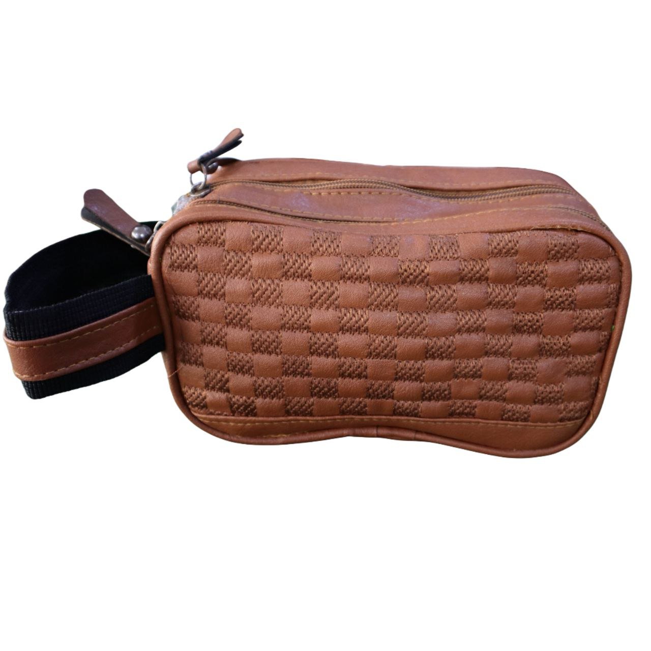 حقيبة يد مميزة بتصميم كلاسيكي-عصري. تتميز بخامة ذات نقشة المربعات المنسوجة ثلاثية الأبعاد (تُعرف أيضاً بنقشة الدامير أو الشطرنج) بلون بني جملي دافئ. هذه النقشة المنسوجة تمنح الحقيبة ملمساً فريداً وتفصيلاً فاخراً. الحقيبة ذات حجم عملي مع سحابين رئيسيين، وهي مثالية ككلتش أو كحقيبة تواليت فاخرة للسفر.