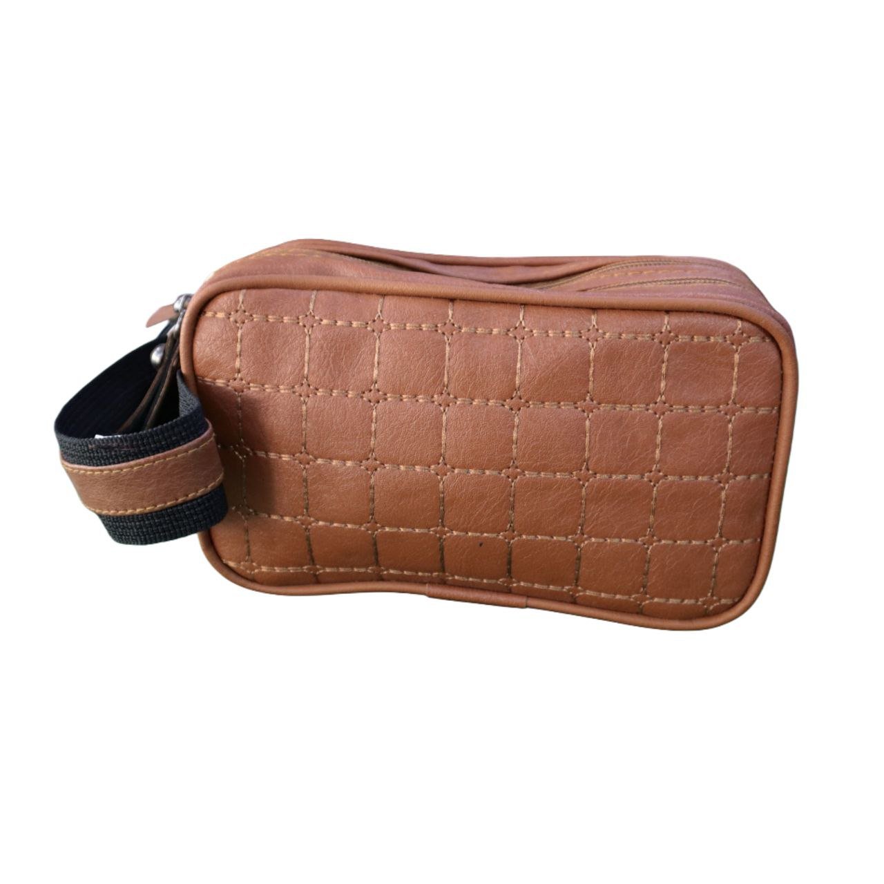 حقيبة يد رجالية أنيقة بلون بني كلاسيكي، بتصميم مميز يعتمد على النقشة المبطنة (المربعات المُحاكة). الخياطة المتناسقة بلون مشابه للجلد تمنحها مظهراً متجانساً وراقياً. مثالية كحقيبة يد يومية أو كحقيبة منظمة لمستلزمات السفر والعناية الشخصية بلمسة من الأناقة التقليدية.