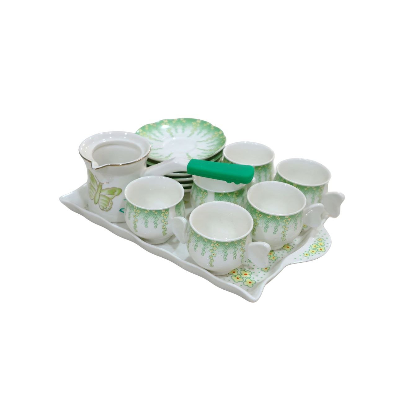 - يحتوي على 6 أكواب يدها على شكل أجنحة فراشة أنيقة، صحون مطابقة، وعاء سكر (بغطاء أخضر)، وعاء حليب/كريمة، وجميعها مرتبة على صينية تقديم بيضاء مزينة برسومات زهور خضراء وصفراء.