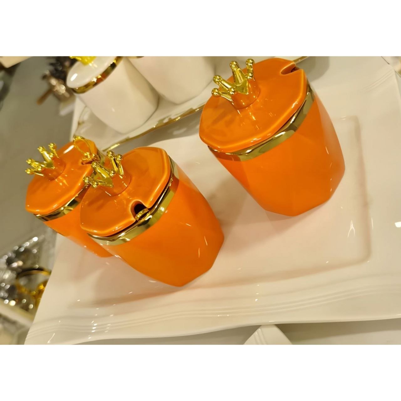 أضف إشراقة جريئة وحيوية لضيافتك مع طقم التقديم “شروق”. يتميز بلونه البرتقالي المفعم بالحياة، والذي يمتزج بأناقة مع التفاصيل الذهبية الفاخرة والتاج الذي يزين كل غطاء. هذا الطقم ليس مجرد أداة تقديم، بل هو قطعة ديكور عصرية تخطف الأنظار وتضفي طابعاً من المرح والفخامة على أي مكان. مثالي لتقديم السكر، البهارات، أو الحلويات الصغيرة، وهو الاختيار الأمثل لمن يبحث عن تصميم فريد وغير تقليدي.
