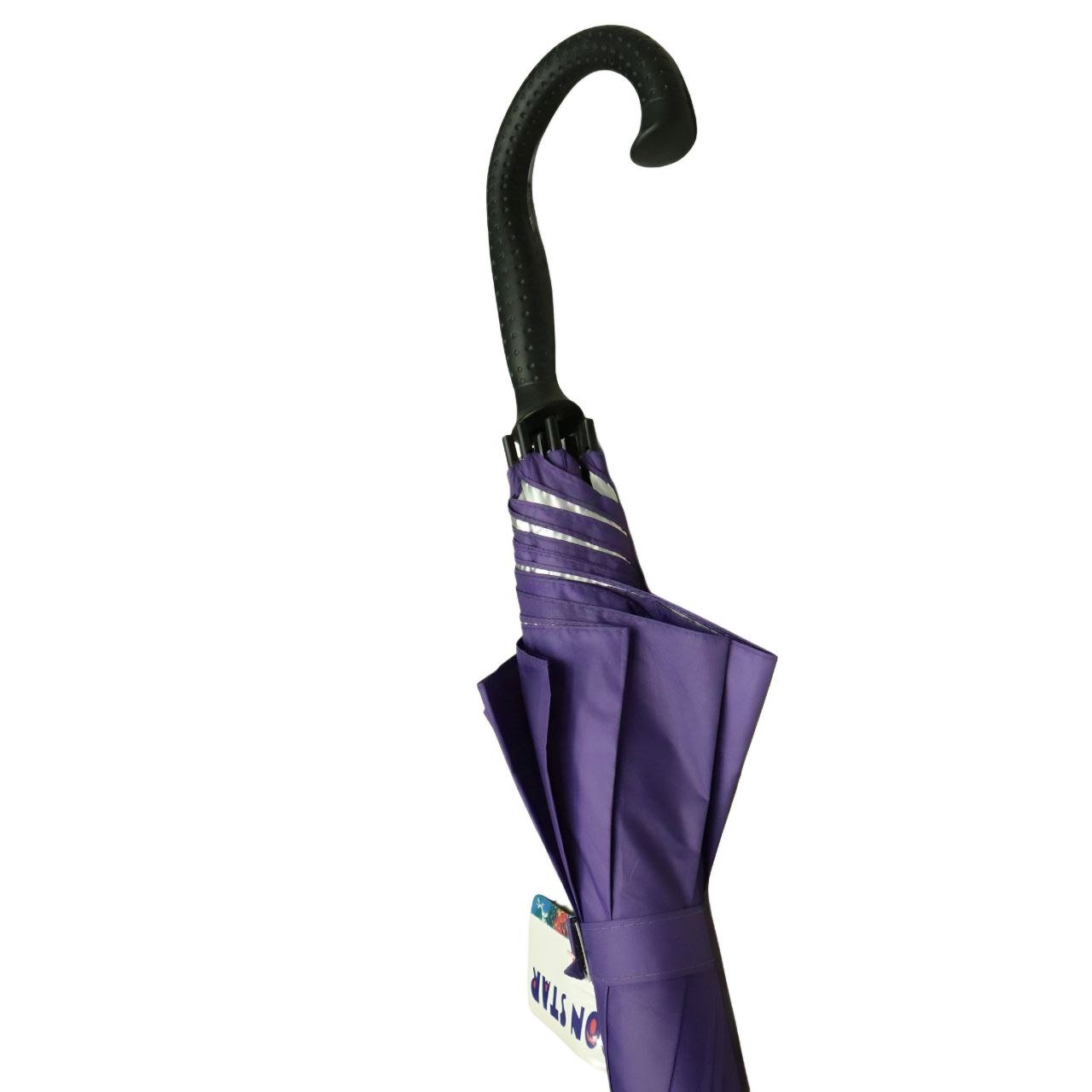 مظلة بتصميم كلاسيكي ومقبض معقوف مريح باللون الأسود. تتميز بقماشها باللون البنفسجي الحيوي، مع خطوط ميتاليكية فضية على حواف الطيات تضفي لمسة من الأناقة. مثالية لحمايتك من الأمطار أو أشعة الشمس، وتضيف لوناً مميزاً إلى إطلالتك.