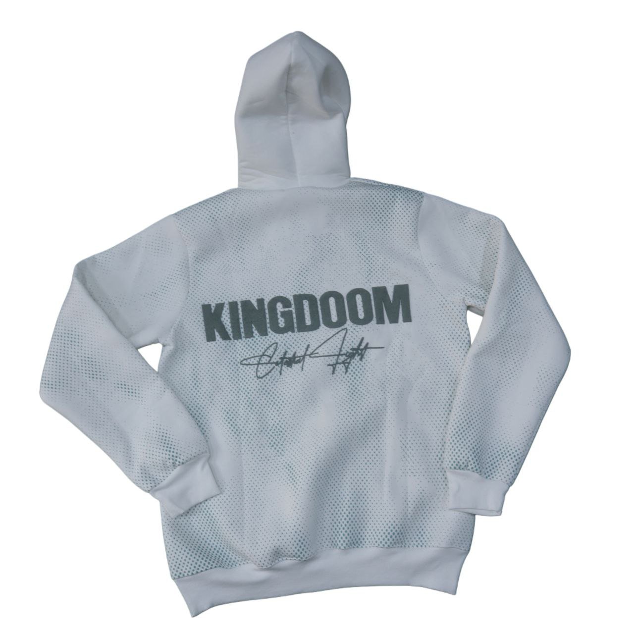 التصميم الخلفي (Focus): يركز التصميم على الجزء الخلفي للهودي، حيث تبرز كلمة “KINGDOM” بخط جريء وكبير باللون الرمادي الفاتح، مع توقيع أو شعار إضافي أسفلها. هذا التصميم الخلفي يجعله مثالياً لعشاق إطلالات “الشارع” التي تبرز الشعار من الخلف.