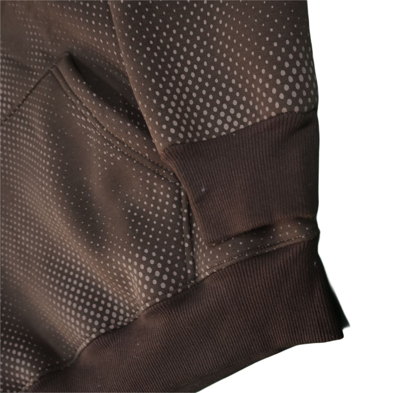 الخامة والملمس: يتميز الهودي بقماش أسود مغطى بنقشة دقيقة شبكية أو نقطية (Hexagonal/Dot Pattern) باللون الرمادي أو الأسود الخفيف على كامل القطعة. هذا الملمس يضفي عمقاً وحيوية على اللون الأسود التقليدي.